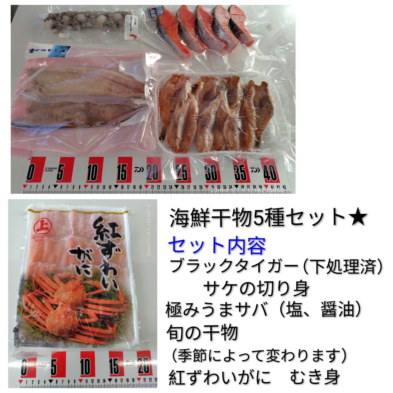 ・紅ずわいがに むき身1パック、極みうまサバ1尾分(塩&醤油みりん 半身ずつ)、サケの切り身(5切れ)、旬の干物(季節によって変わります)1パック、ブラックタイガー(下処理済み)5尾 が入ったセット商品です。